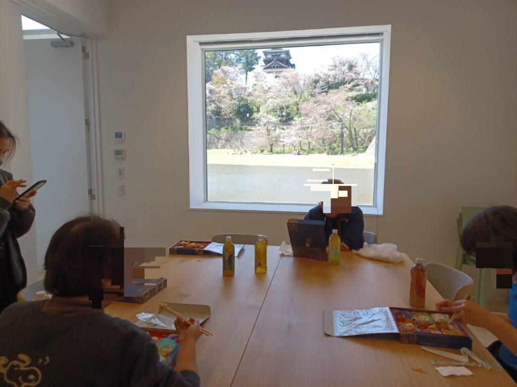 「丸岡城マチヨリマーケット」の一室を借りて桜をバックにお弁当タイム🌸